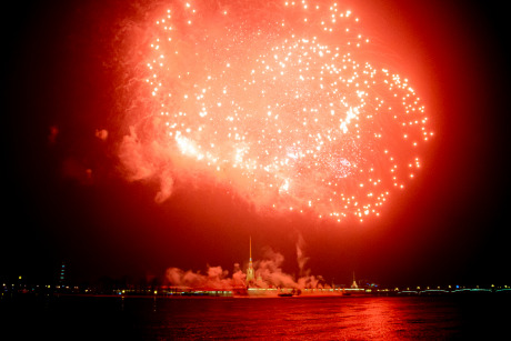 Основная программа мероприятий завершилась реконструкцией салютного залпа, того самого, который 76 лет назад озарил небо над освобожденным Ленинградом. Специальная технология и зенитные орудия того времени позволили создать фейерверк в виде тонких длинных лучей.